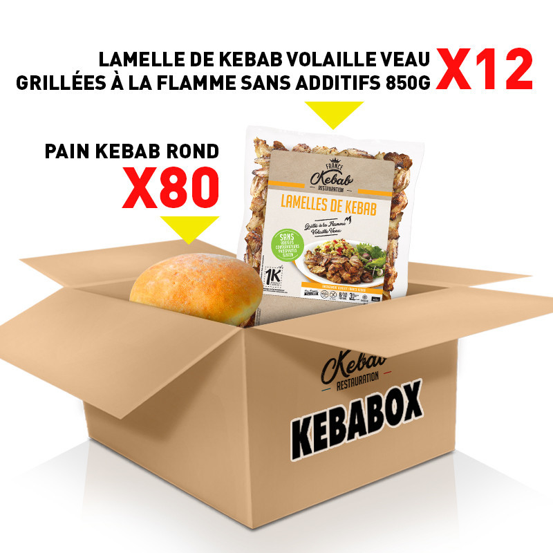 Composée de délicieuses lamelles de kebab volaille veau grillées à la flamme, sans additifs, sans conservateurs et sans gluten et de pain rond de qualité à la texture moelleuse et aérée, la kebabox c'est la solution pratique pour réaliser facilement 80 kebab.