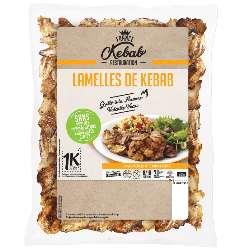 Elaborée à partir de viande de volaille et de veau ces lamelles de kebab Sans additifs, phosphates, gluten et conservateurs se réchauffe en 3 minutes à la poêle. Un produit 100% service idéal en topping.
